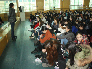 3月9日下午学生大会,内容:开学动员会、辅导员高媛,班主任王尚清主持会议。
