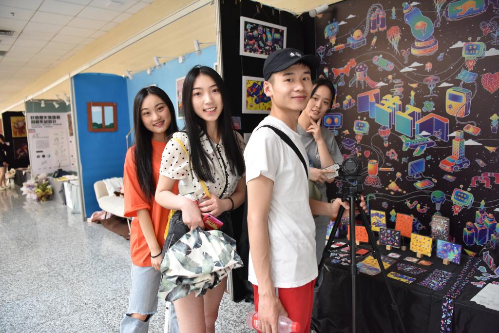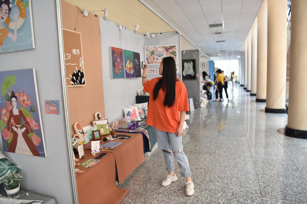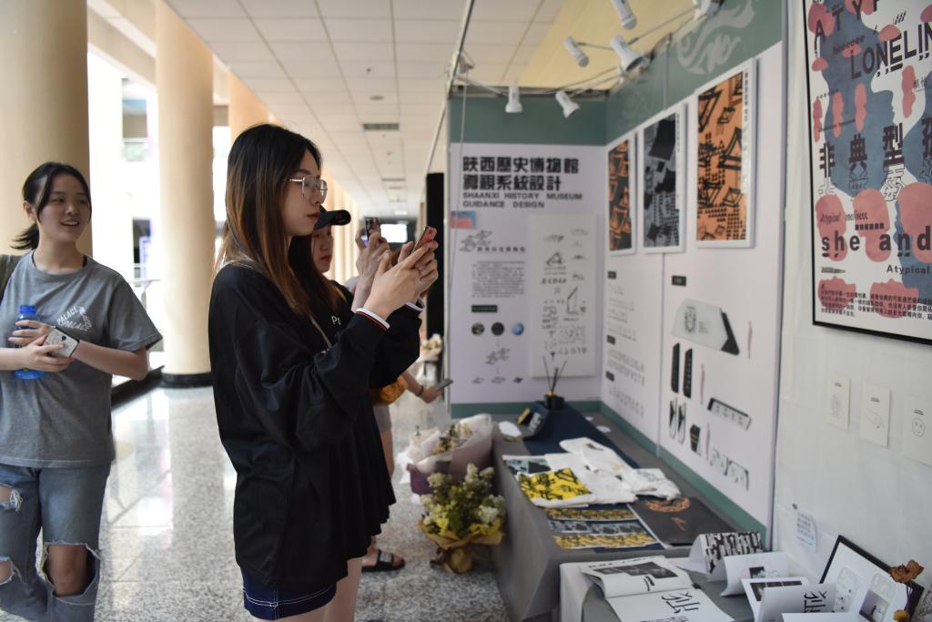 我们进入展厅,映入眼帘的是西北大学艺术学院毕业设计展览,所有的毕业生作品全部都展示在博物馆大厅内,从一楼到四楼分为了美术设计、动画设计、建筑设计以及画展四个区域。同学们进入大厅后就被这些作品所吸引,一个个的展台看过去,不禁感慨艺术的博大与神奇。所谓隔行如隔山,虽然有些作品并不能理解透彻,但是能看出最终呈现出来的作品都是费劲心思的,均是设计者的努力成果。
