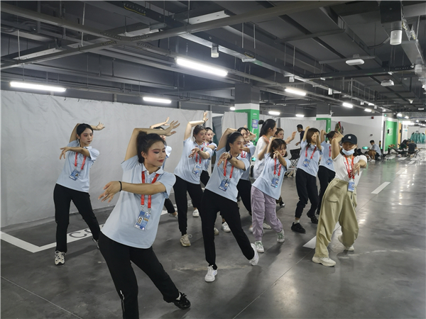 地库休息区,领队老师带领学生们练习唐舞片段,要求每个动作从质感到美感都要精细到位,力求完美。