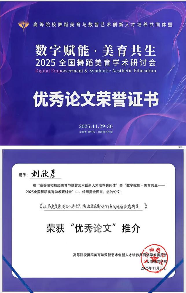11月29日至30日,由全国艺术专业学位研究生教育指导委员会指导,太原师范学院主办的“高等院校舞蹈美育与数智艺术创新人才培养共同体暨‘数字赋能·美育共生’2025全国舞蹈美育学术研讨会”在山西晋中成功举行。我院2023级舞蹈学专业硕士研究生刘欣彦同学在大会青年学者论坛中宣讲论文《从历史复原到文化再生产:陕西唐乐舞“仿”的当代话语实践研究》,获得了评议专家与在场同行的积极关注与认可,荣获“优秀论文奖”。