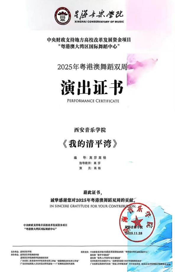 11月28日,舞蹈学院2025级研究生高杨创作和表演的作品《我的清平湾》成功入围星海音乐学院主办的“2025粤港澳舞蹈双周”青年舞展作品征集与评选。本次展演旨在搭建高水平舞蹈学术交流平台,以作品展演和学术活动,推动舞蹈艺术与人文科技的交叉研究,厚舞蹈学科之文化基础,宽舞蹈文化建设之发展格局。